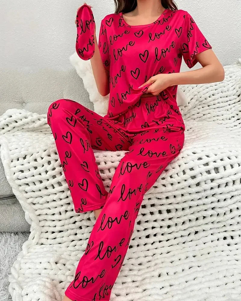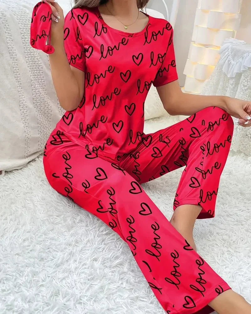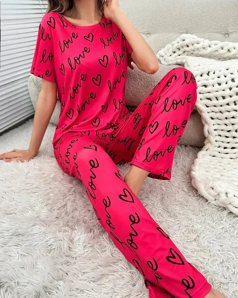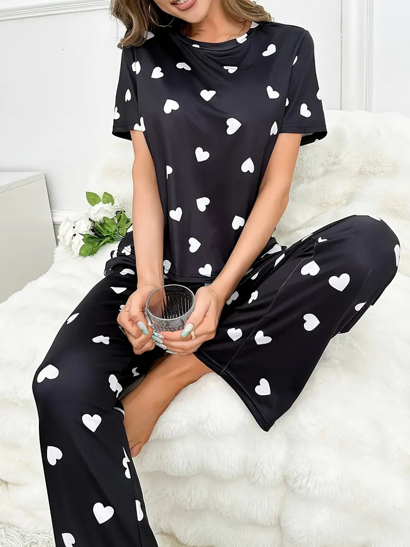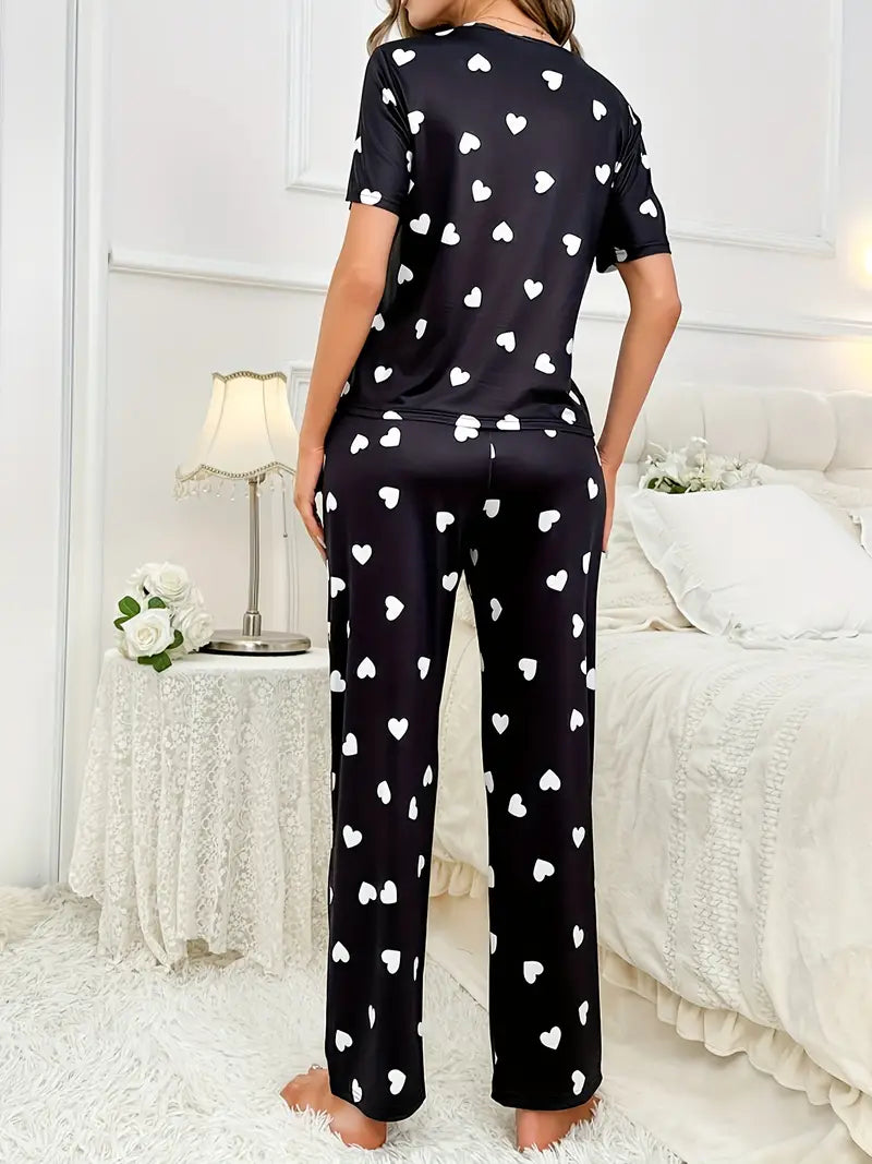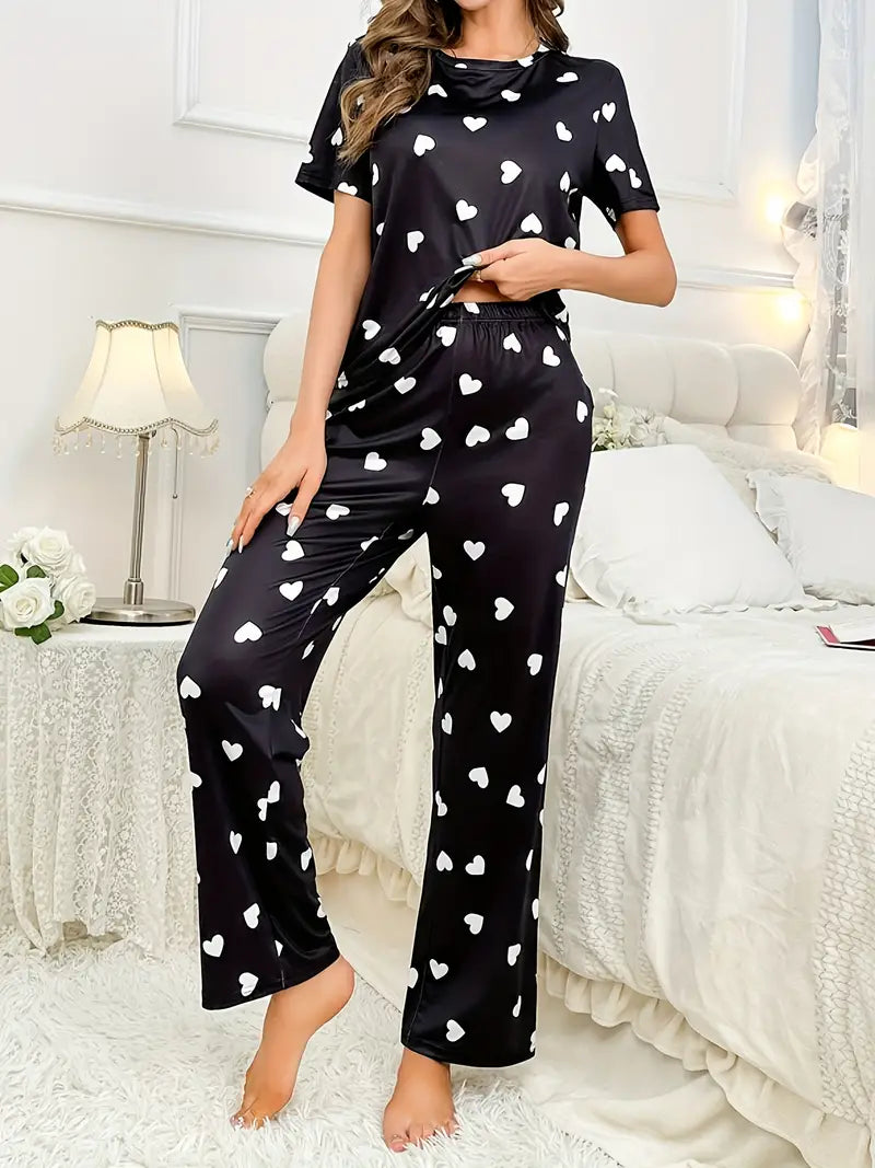 Heart Print Pajamas Set, Short Sleeve Crew Neck Top & Lounge Pants, Women's Sleepwear & Loungewear