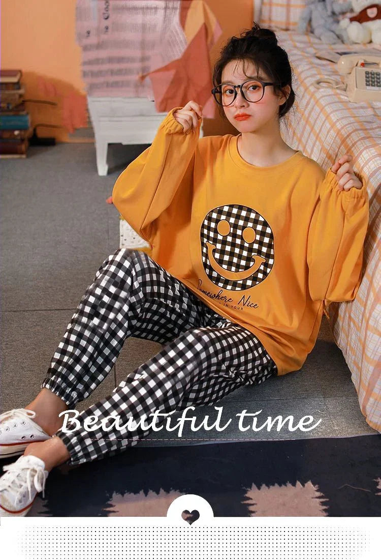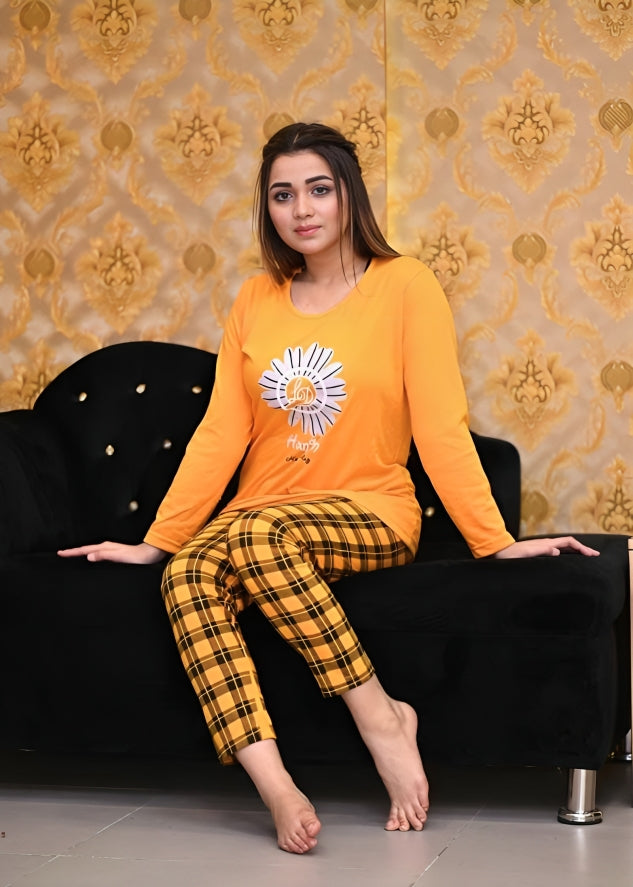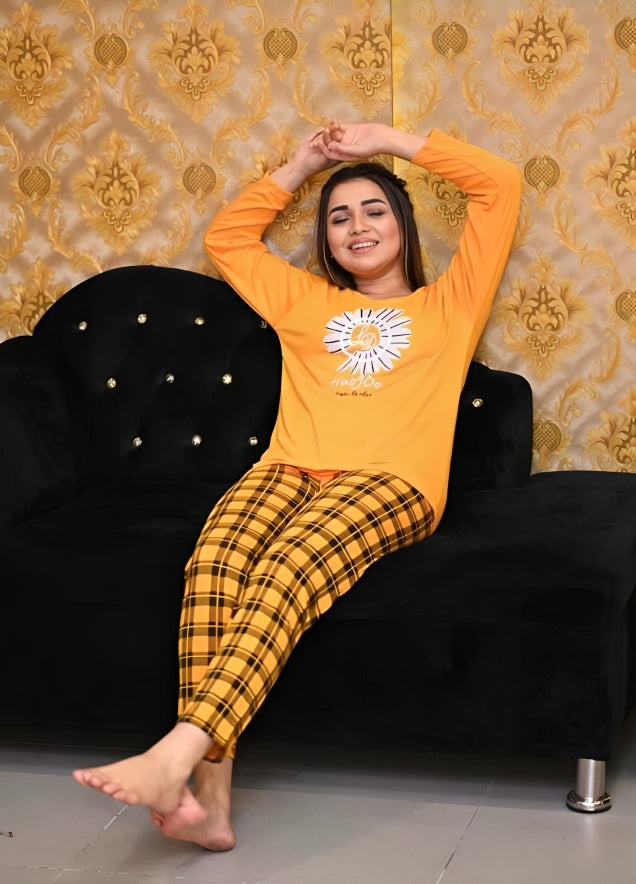 Yellow Donut With Check Style Pajama Printed Night Suit